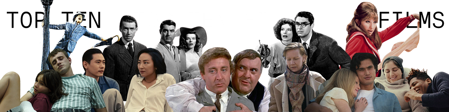Honourable mentions: Triangle of Sadness (2022); The Worst Person in the World (2021); Black Bear (2020); Waiting for Guffman (1996); Jane Fonda in Five Acts (2018); Heat (1995); Theatre Camp (2023); The Life Aquatic with Steve Zissou (2004); The Way We Were (1973); Bergman Island (2021); Duck Soup (1933).