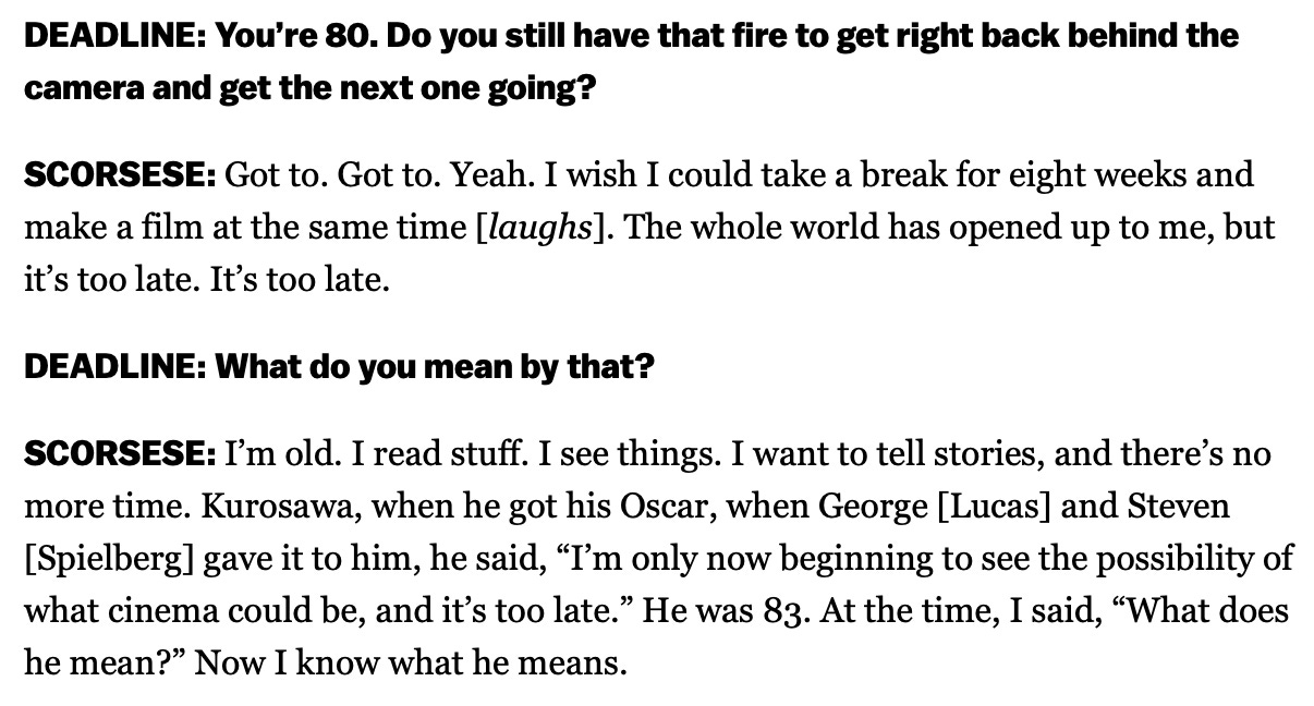 I was incredibly moved by Martin Scorsese’s recent Deadline interview in which he described a propulsive desire to create, marred only by a realization that time is closing in: